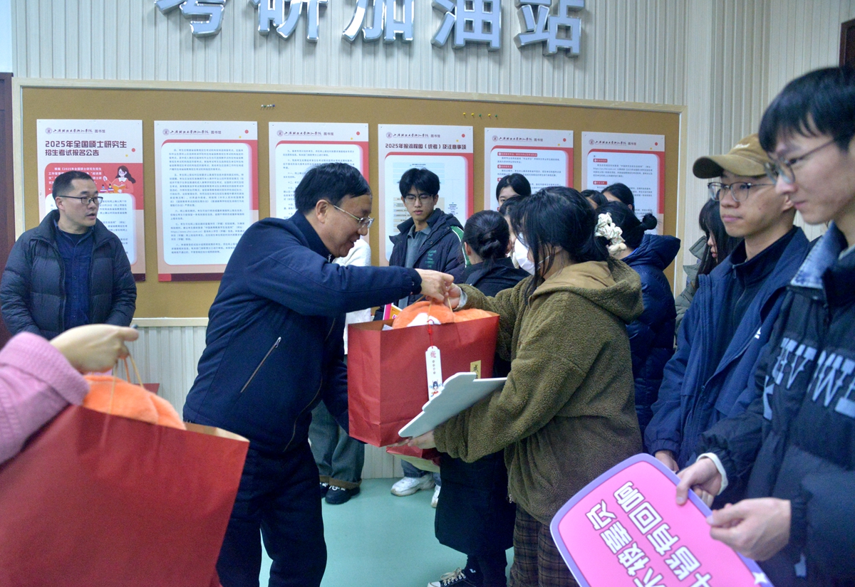 活动现场,邱风还为考研学子们送上了“考研大礼包”,礼包内含暖手玩偶、文具套装等实用物品,每一份礼物都承载着学院对学子们的深切期望和美好祝愿。