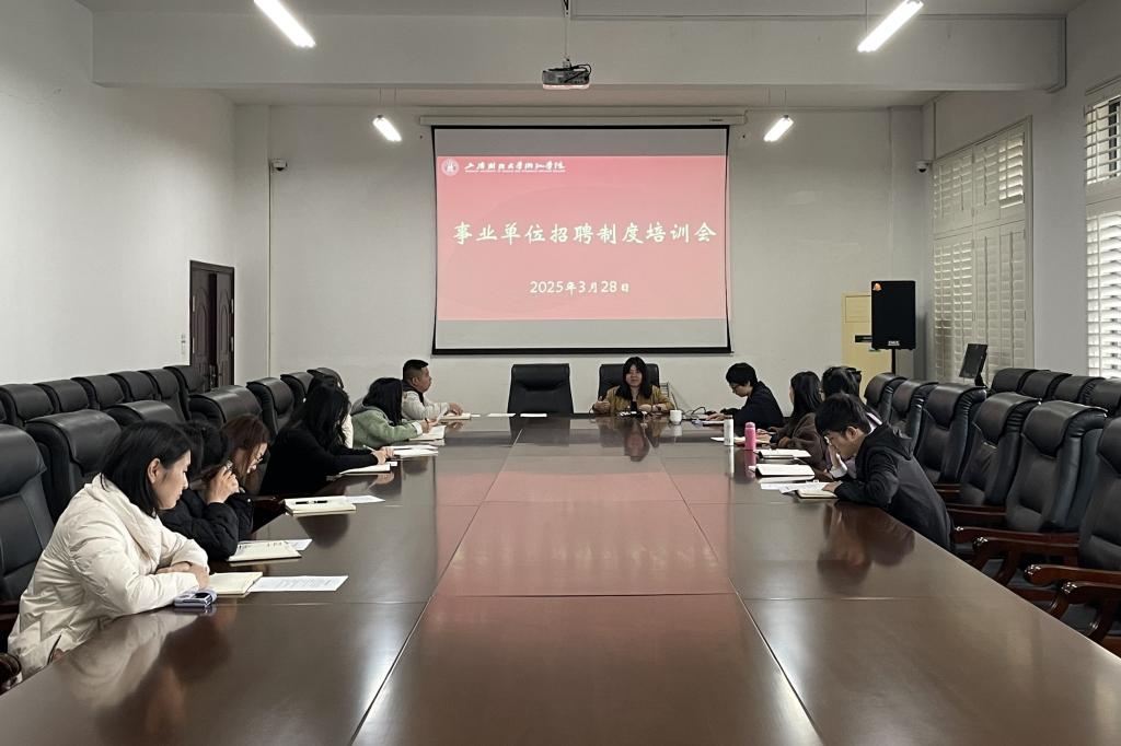 为进一步推动学院高质量发展,落实巡察整改工作要求,全面了解上级招聘相关制度,3月28日上午,学院组织开展事业单位招聘制度培训会,邀请市人力社保局事业单位人事管理处袁莎莎作专题讲座。各系(部)人事师资联络员、人事处招聘相关人员参加培训。