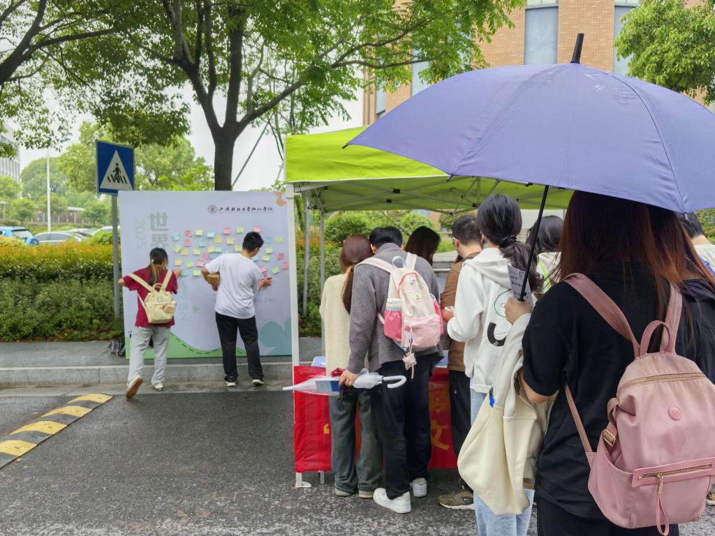 当天上午,校园主干道化身文学盛宴现场。数百名学生在便利贴上写下世界文学经典名句并标注出处,一张张承载着《哈姆雷特》《浮士德》等中外名著金句的纸条,在展板上汇成绚丽的文化拼图。随后的“闪电问答”环节中,参与者随机抽取文学知识题目,在限时闯关中重温《堂吉诃德》的骑士精神、《追风筝的人》的救赎之旅等经典故事。现场笑声与掌声交织,同学们在趣味互动中深化了对世界文学的理解。